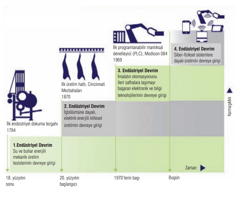 İlk sanayi devrimi (1.0) su ve buhar gücünü kullanarak mekanik üretim sistemleri ile ortaya çıktı. İkinci sanayi devrimi (2.0) ile elektrik gücünün yardımıyla seri üretim tanıtılmıştı. Üçüncü sanayi devriminde (3.0) ise dijital devrim, elektroniklerin kullanımı ve BT (Bilgi Teknolojileri)'nin gelişmesiyle üretim daha da otomatikleştirildi. Şimdi dördüncü sanayi devrimi (4.0)'ı incelemeden önce bu gelişimi bir de tarihsel olarak inceleyelim.